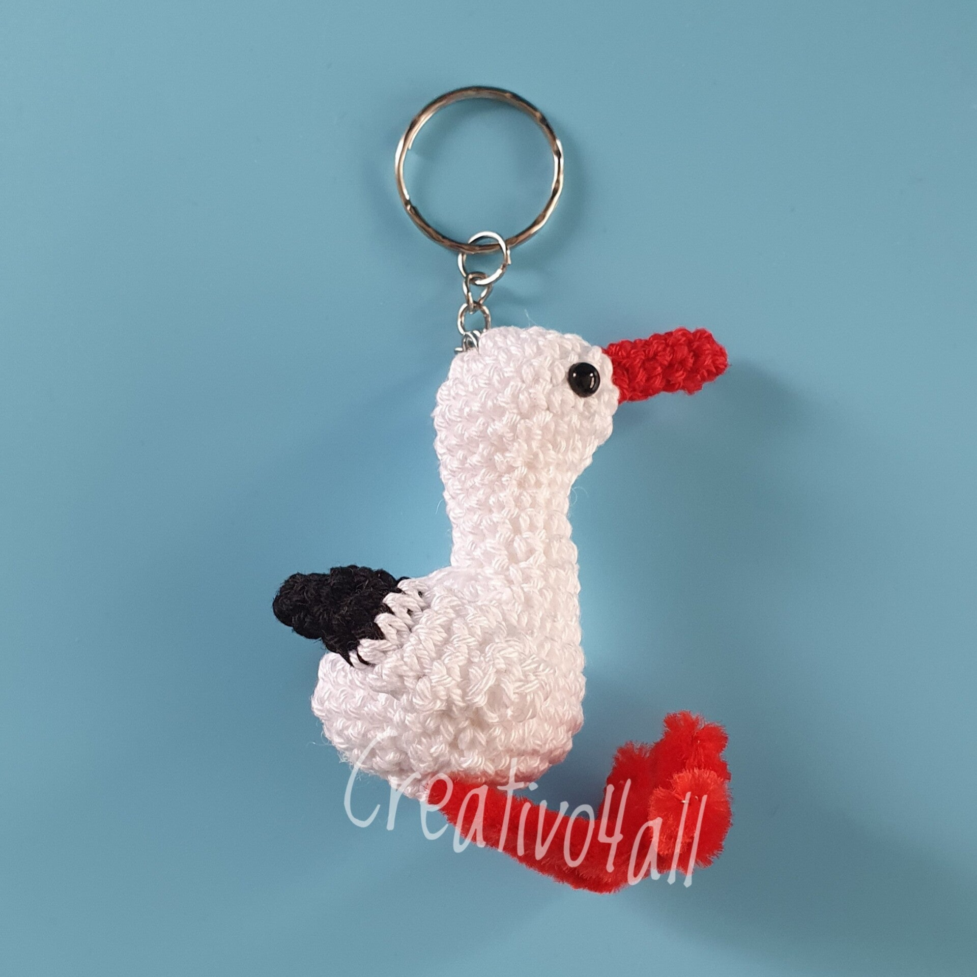 Schattige gehaakte amigurumi Ooievaar sleutelhanger.